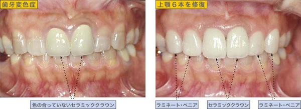 テトラサイクリンという抗生物質の服用などにより、生まれながらに歯の色が暗く、茶色っぽい色を呈している場合があります。重度の場合では、歯牙漂白だけでは色の改善は難しいといえます。このような場合は、歯牙の表面を一層削合し、セラミックベニアを貼り付ける方法が有効であると思われます。